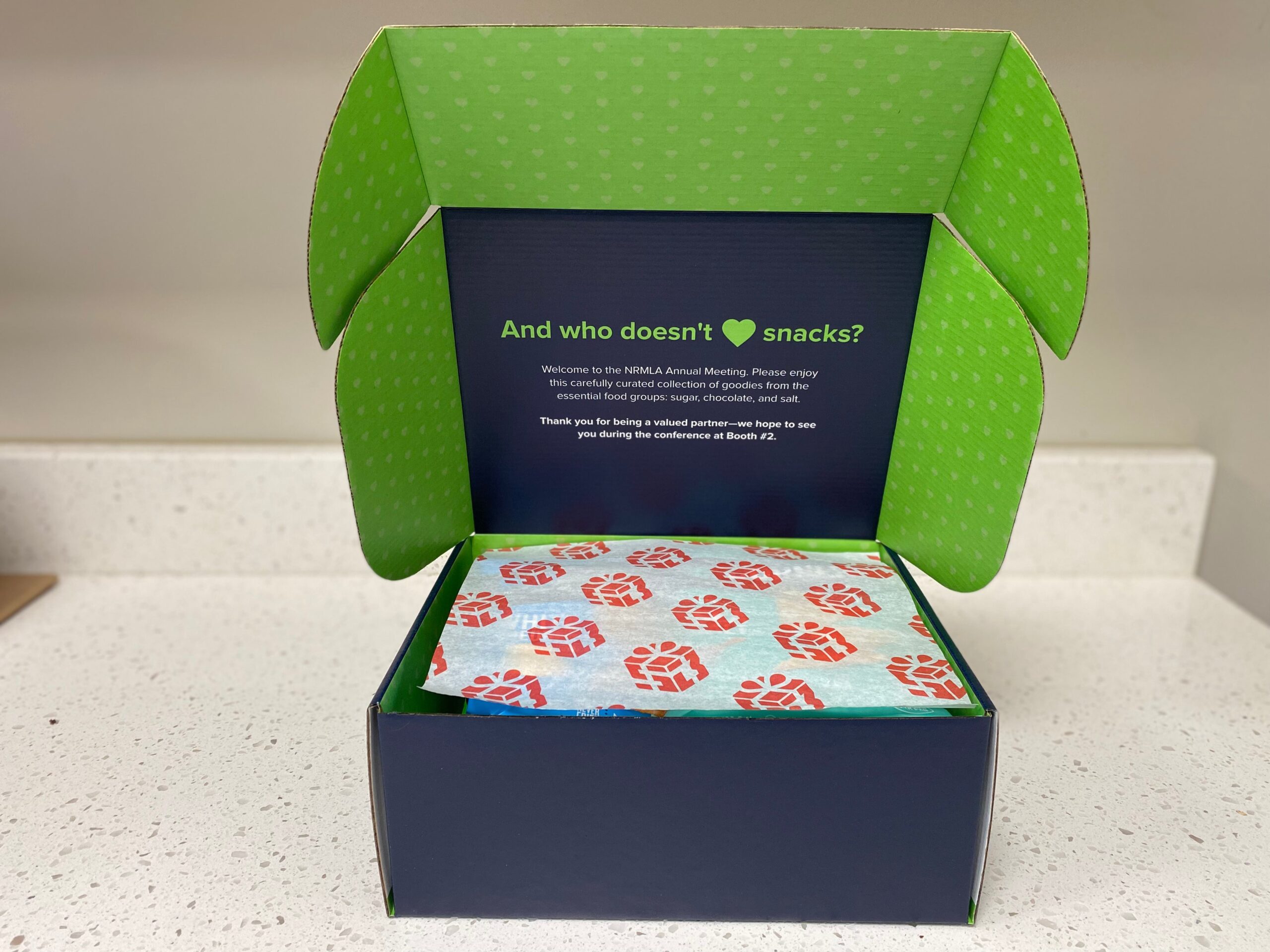 Design the outside and inside of your box with company logos, design elements, and a generic gift message.